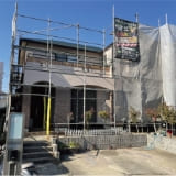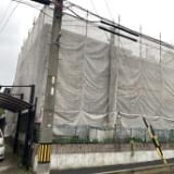 塗料等が近隣に飛散しないように、足場全体に養生シートを貼りつめます。