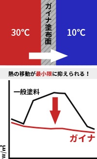 ガイナを建物の外部に塗布すると、外気温度とガイナの塗膜面の温度差が小さくなり、熱の移動を最小限に抑えられます。