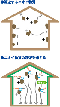 ガイナの塗膜から放射された遠赤外線が空気中の水分子に当たると、その分子を激しく振動させ細かくし、マイナスイオン化します。このマイナスイオン化した水分が浮遊している汚濁物質と結合してその浮遊を抑えるため、効果的に消臭・空気質改善効果を発揮します。
