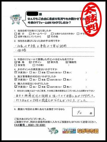 社長のやる気と事前の説明が決め手です。毎日の施工状況の説明が非常に分かりやすかった。